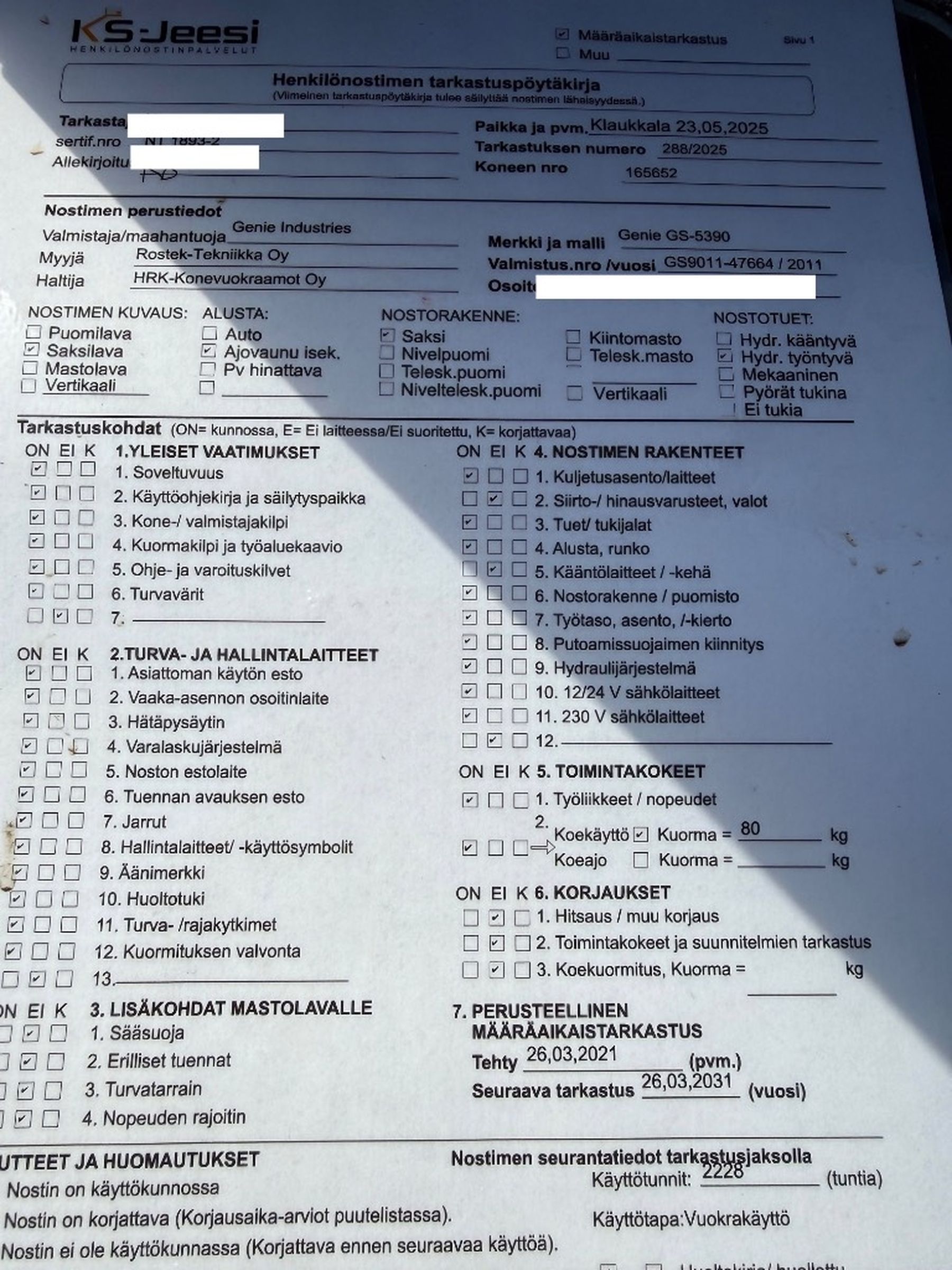 Huollettu ja tarkastettu vuosittain.